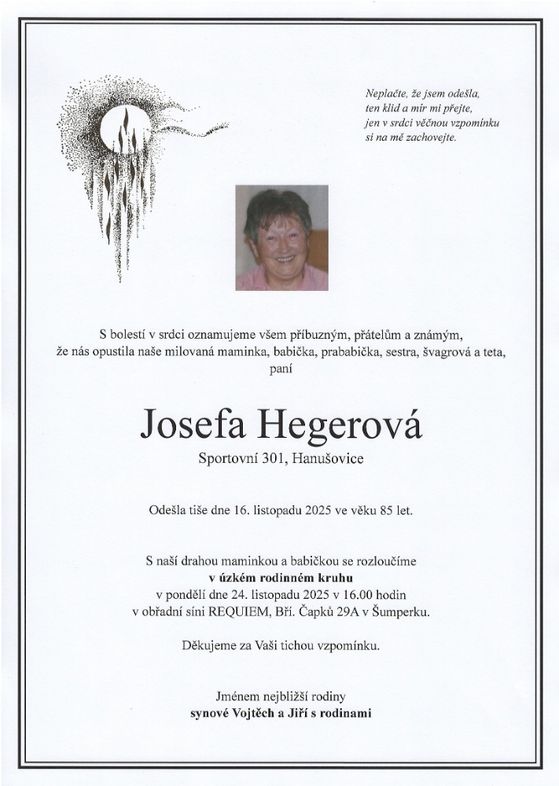 | Josefa Hegerová | 1940 | 16.11.2025 | Hanušovice | bez obřadu |