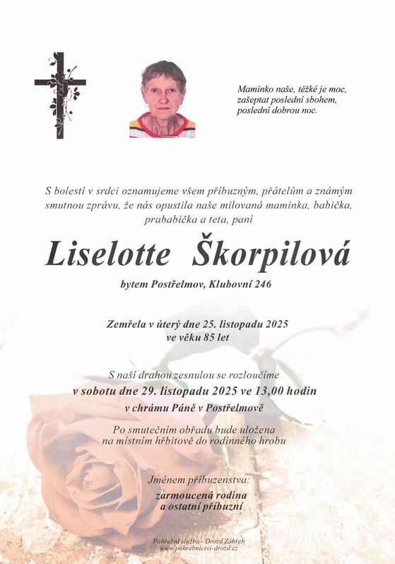 | Liselotte Škorpilová | 1940 | 25.11.2025 | Postřelmov | s obřadem |