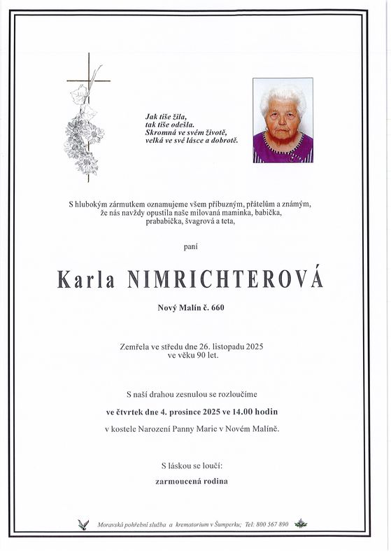 | Karla Nimrichterová | 1935 | 26.11.2025 | Nový Malín | s obřadem |