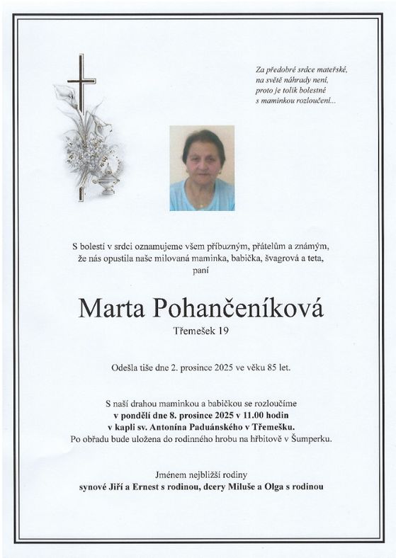 | Marta Pohančeníková | 1940 | 02.12.2025 | Třemešek | s obřadem |