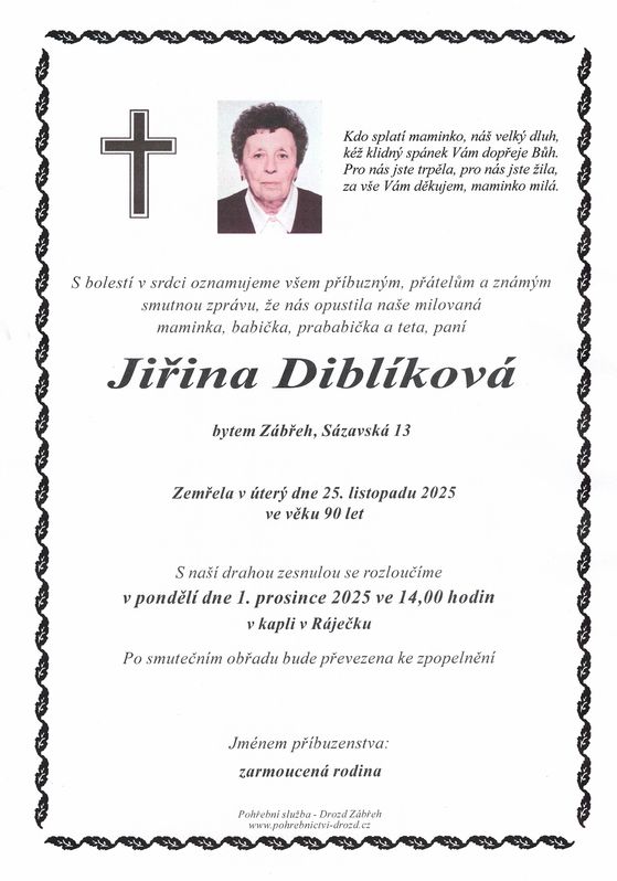 | Jiřina Diblíková | 1935 | 25.11.2025 | Zábřeh - Ráječek | s obřadem |