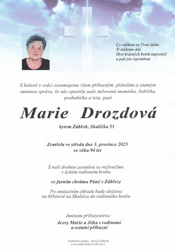 | Marie Drozdová | 1931 | 03.12.2025 | Zábřeh-Skalička | s obřadem |