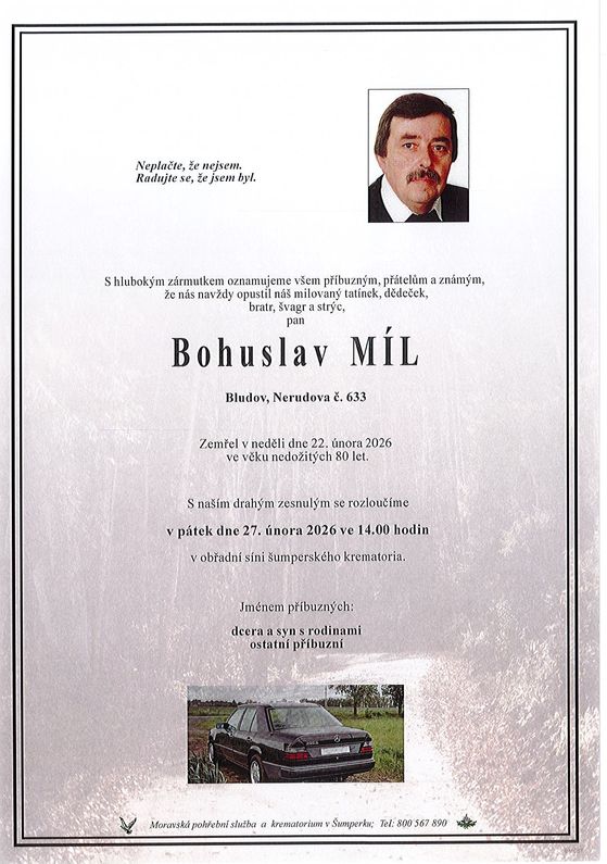| Bohuslav Míl | 1946 | 22.02.2026 | Bludov | s obřadem |