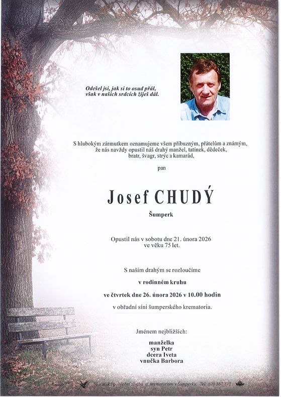 | Josef Chudý | 1950 | 21.02.2026 | Šumperk | s obřadem |