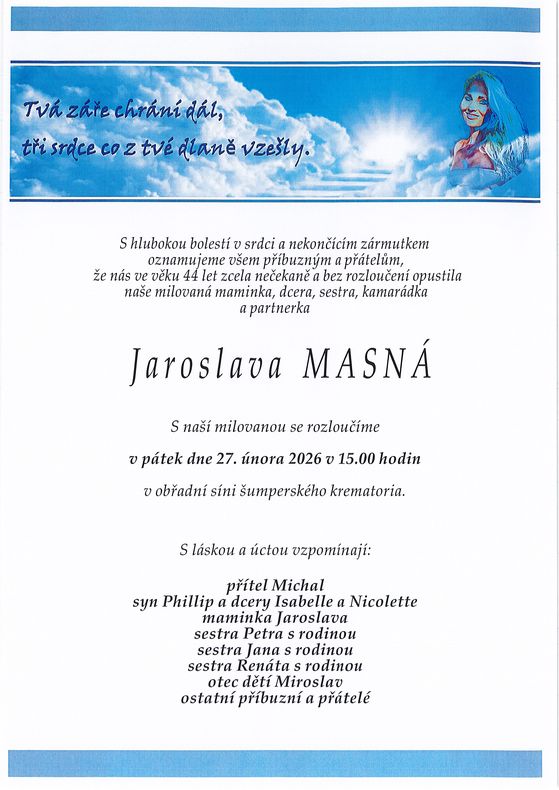 | Jaroslava Masná | 1981 | 21.02.2026 | s obřadem |