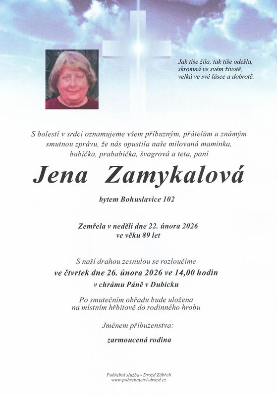 | Jena Zamykalová | 1936 | 22.02.2026 | Bohuslavice | s obřadem |