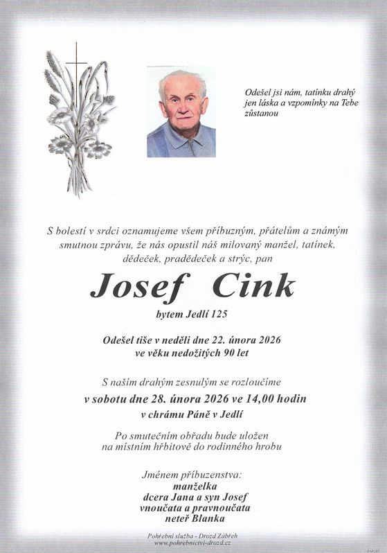 | Josef Cink | 1936 | 22.02.2026 | Jedlí | s obřadem |