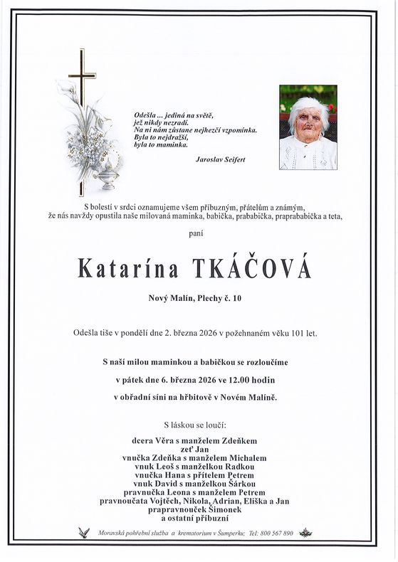 | Katarína Tkáčová | 1924 | 02.03.2026 | Nový Malín - Plechy | s obřadem |