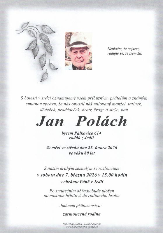 | Jan Polách | 1945 | 25.02.2026 | Palkovice | s obřadem |