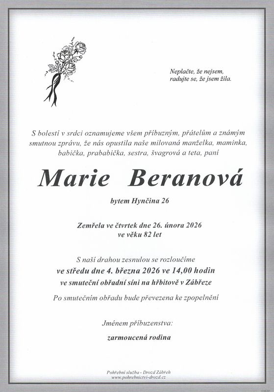 | Marie Beranová | 1943 | 26.02.2026 | Hynčina | s obřadem |