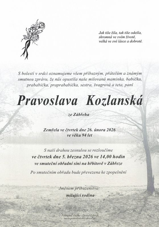 | Pravoslava Kozlanská | 1931 | 26.02.2026 | Štíty | s obřadem |