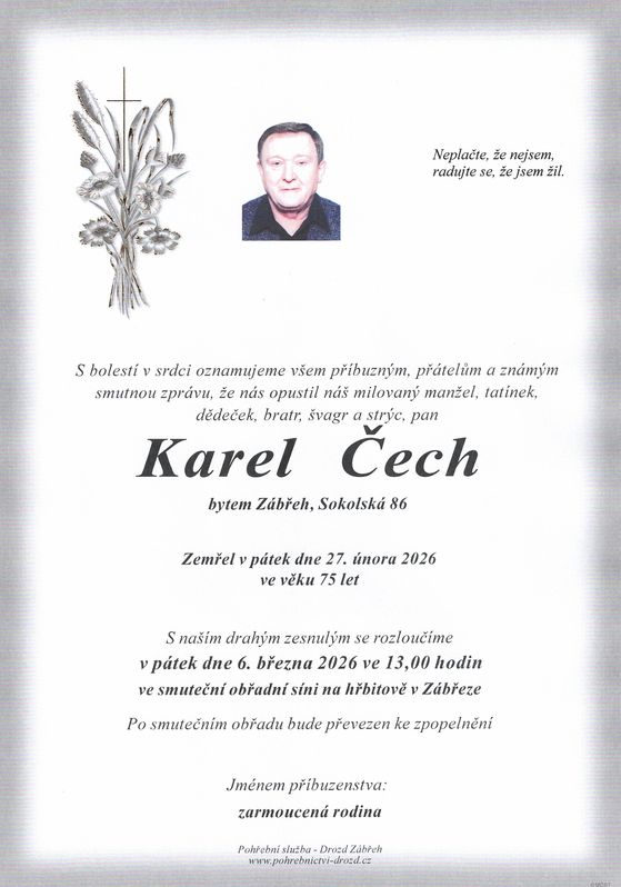 | Karel Čech | 1950 | 27.02.2026 | Zábřeh | s obřadem |