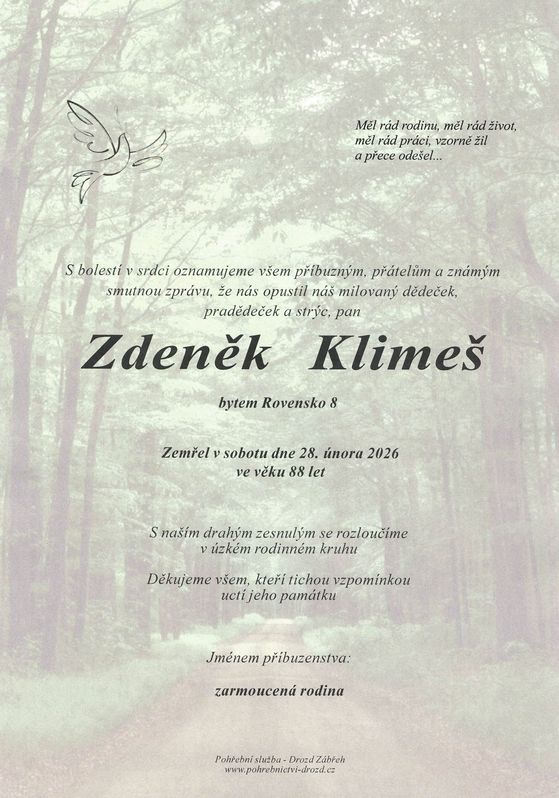 | Zdeněk Klimeš | 1938 | 28.02.2026 | Rovensko | bez obřadu |
