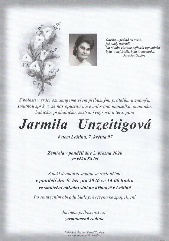 | Jarmila Unzeitigová | 1938 | 03.03.2026 | Leština | s obřadem |