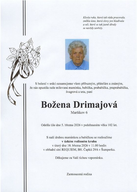 | Božena Drimajová | 1923 | 05.03.2026 | Maršíkov | bez obřadu |