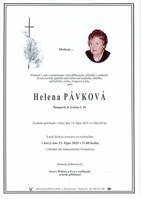 | Helena Pávková | 1941 | 14.10.2025 | Šumperk | s obřadem |