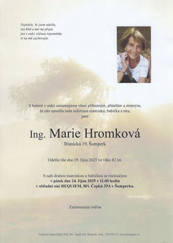 | Ing. Marie Hromková | 1942 | 19.10.2025 | Šumperk | s obřadem |