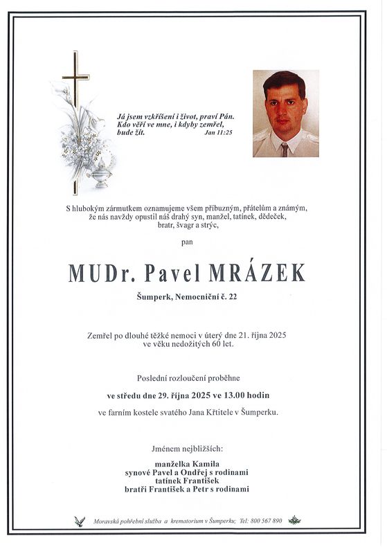 | MUDr. Pavel Mrázek | 1966 | 21.10.2025 | Šumperk | s obřadem |