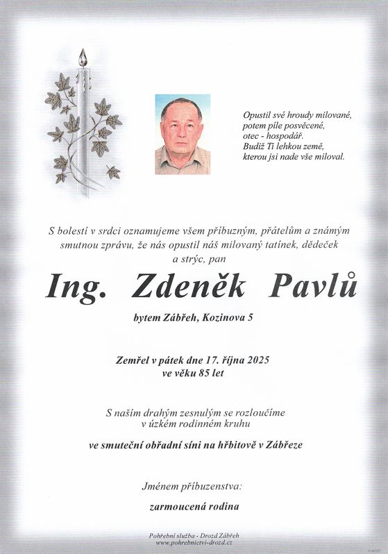 | Ing. Zdeněk Pavlů | 1940 | 17.10.2025 | Zábřeh | s obřadem |