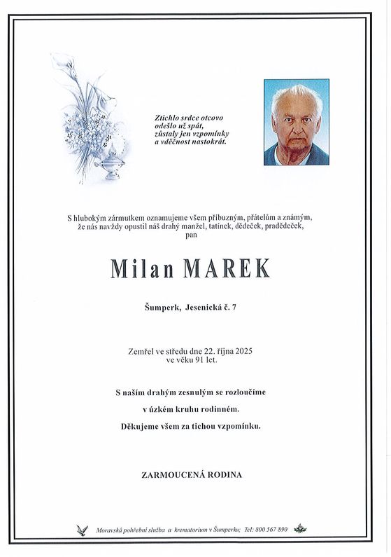 | Milan Marek | 1934 | 22.10.2025 | Šumperk | bez obřadu |