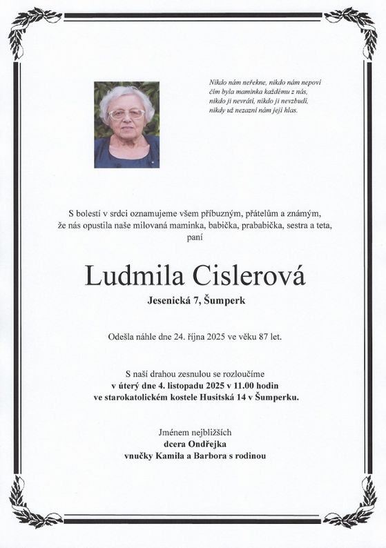 | Ludmila Cislerová | 1938 | 24.10.2025 | Šumperk | s obřadem |