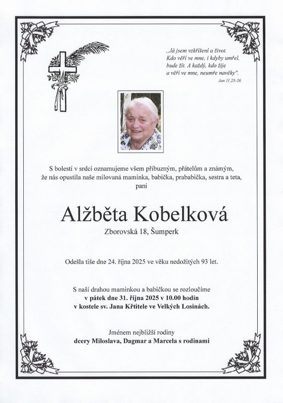 | Alžběta Kobelková | 1932 | 24.10.2025 | Šumperk | s obřadem |