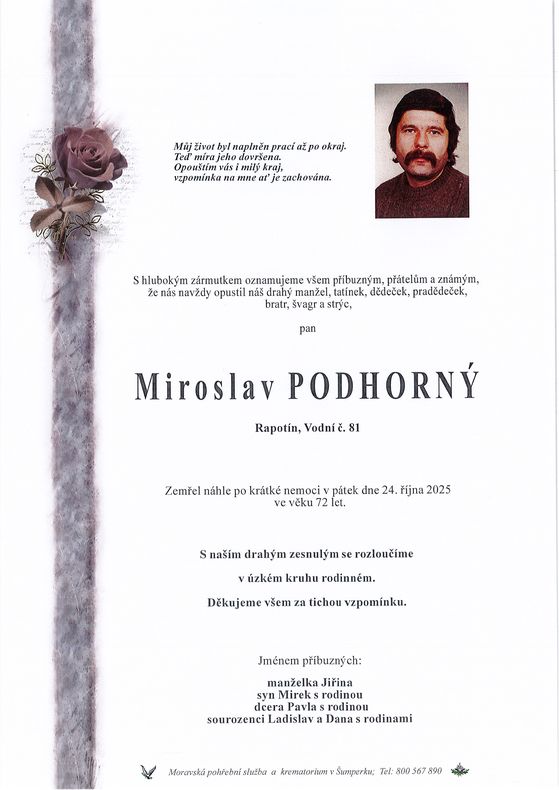| Miroslav Podhorný | 1953 | 24.10.2025 | Rapotín | bez obřadu |
