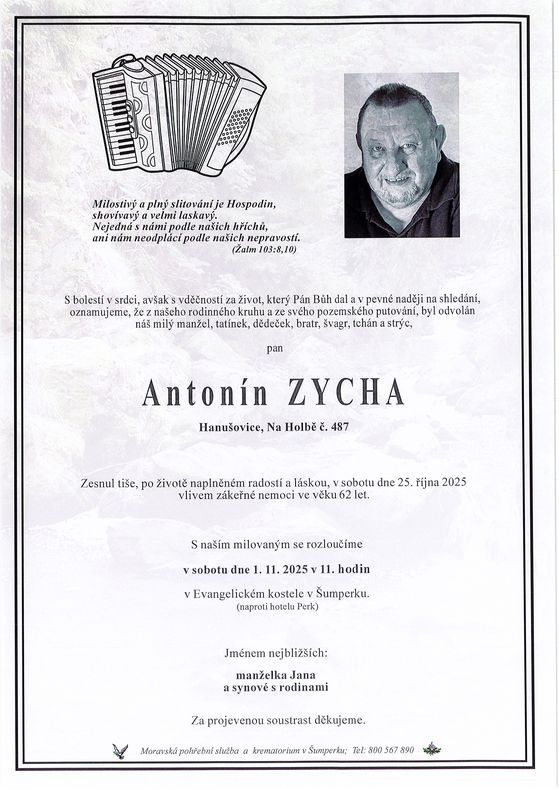 | Antonín Zycha | 1963 | 25.10.2025 | Hanušovice | s obřadem |