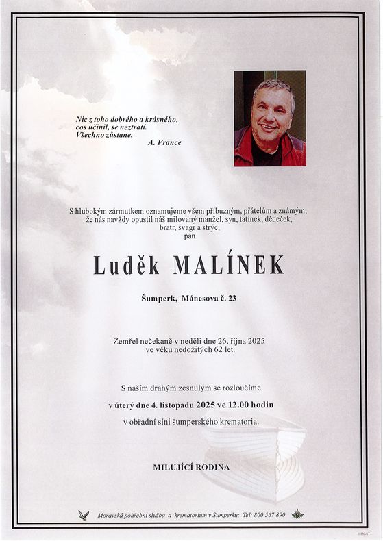 | Luděk Malínek | 1963 | 26.10.2025 | Šumperk | s obřadem |