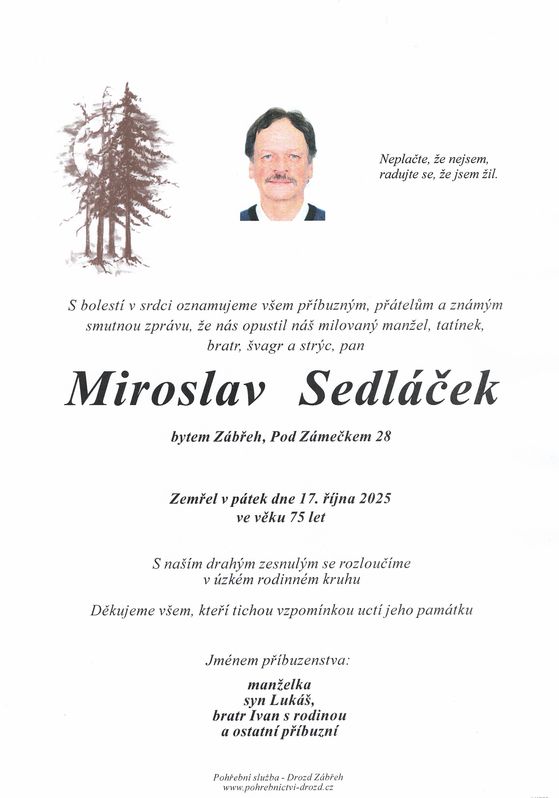 | Miroslav Sedláček | 1950 | 17.10.2025 | Zábřeh | bez obřadu |