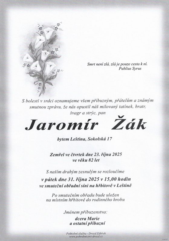 | Jaromír Žák | 1943 | 23.10.2025 | Leština | s obřadem |