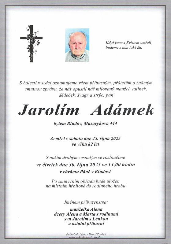 | Jarolím Adámek | 1943 | 25.10.2025 | Bludov | s obřadem |