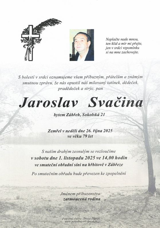 | Jaroslav Svačina | 1946 | 26.10.2025 | Zábřeh | s obřadem |