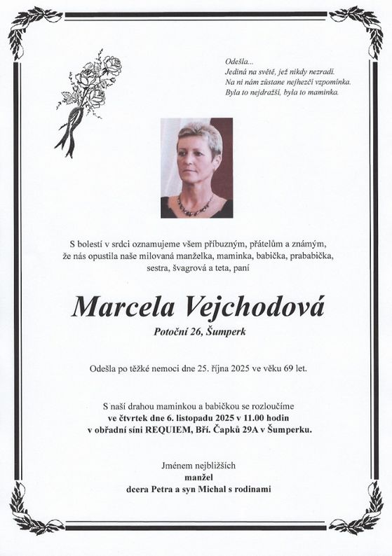 | Marcela Vejchodová | 1956 | 25.10.2025 | Šumperk | s obřadem |