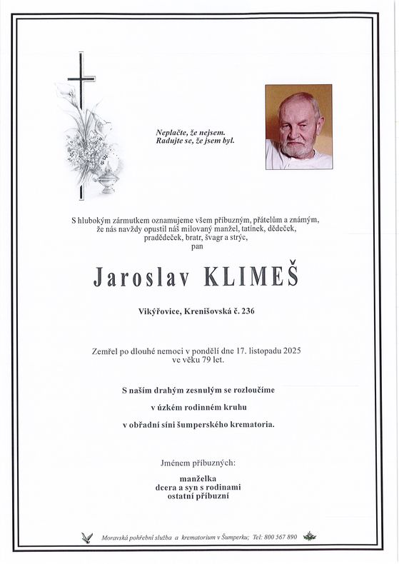 | Jaroslav Klimeš | 1946 | 17.11.2025 | Vikýřovice | s obřadem |