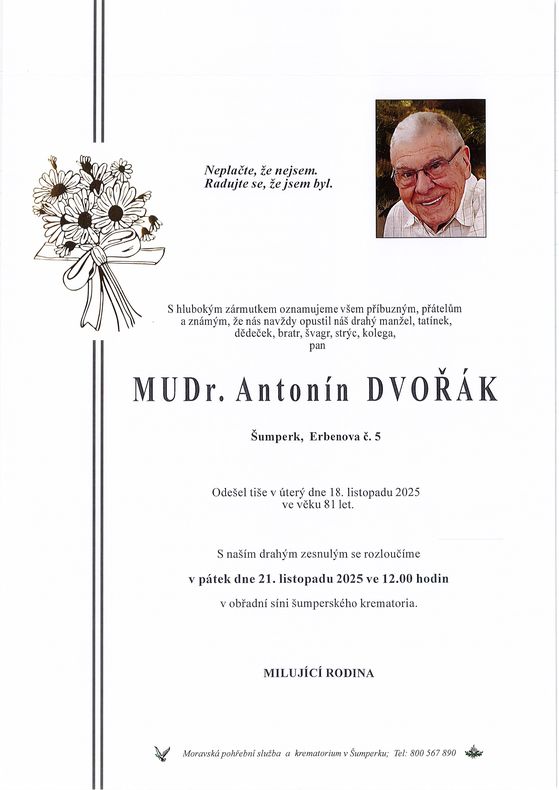 | MUDr. Antonín Dvořák | 1944 | 18.11.2025 | Šumperk | s obřadem |