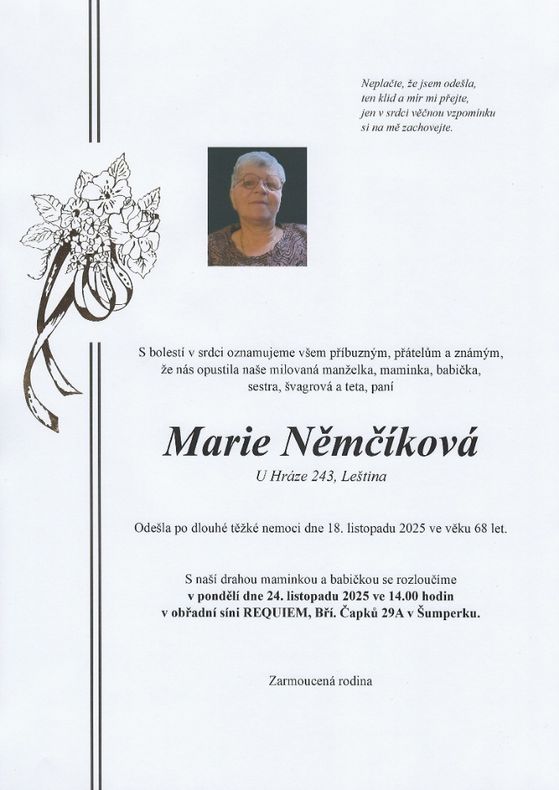 | Marie Němčíková | 1957 | 18.11.2025 | Leština | s obřadem |