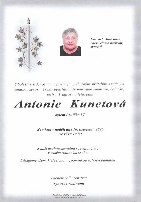| Antonie Kunetová | 1946 | 16.11.2025 | Brníčko | bez obřadu |