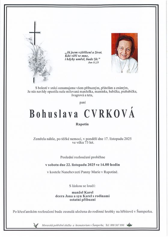 | Bohuslava Cvrková | 1952 | 17.11.2025 | Rapotín | s obřadem |