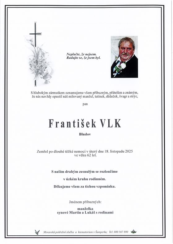 | František Vlk | 1963 | 18.11.2025 | Bludov | bez obřadu |