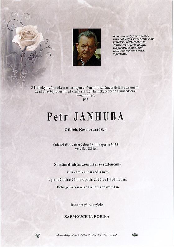 | Petr Janhuba | 1937 | 18.11.2025 | Zábřeh | s obřadem |