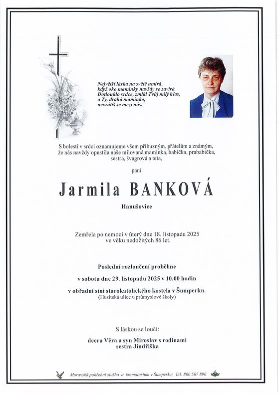 | Jarmila Banková | 1939 | 18.11.2025 | Hanušovice | s obřadem |