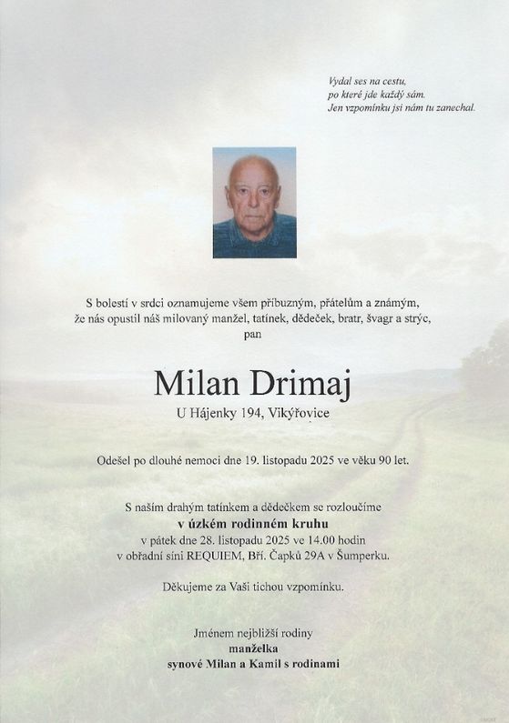 | Milan Drimaj | 1935 | 19.11.2025 | Vikýřovice | bez obřadu |