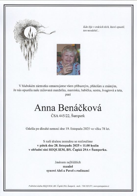 | Anna Benáčková | 1947 | 19.11.2025 | Šumperk | s obřadem |