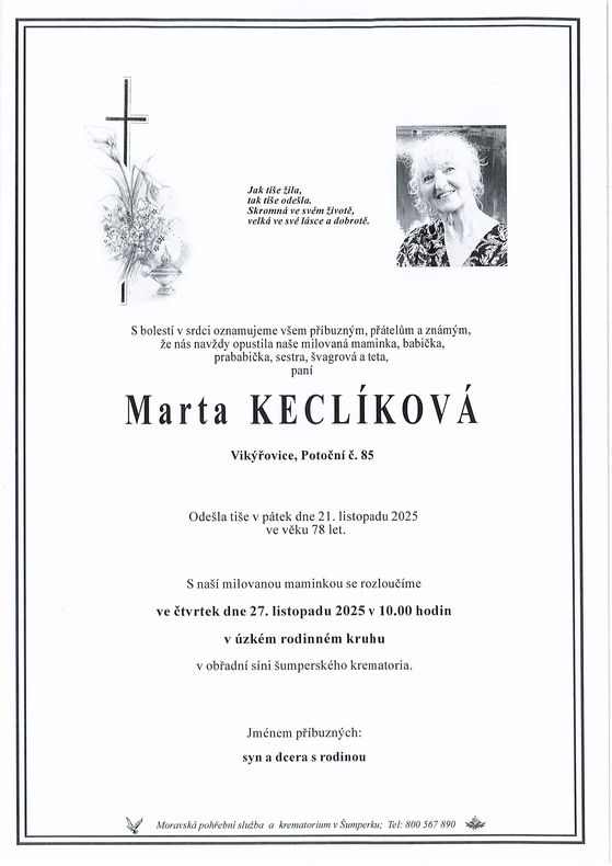 | Marta Keclíková | 1947 | 21.11.2025 | Vikýřovice | s obřadem |