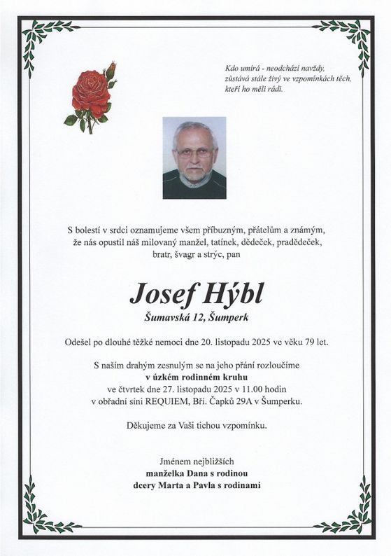 | Josef Hýbl | 1946 | 20.11.2025 | Šumperk | bez obřadu |