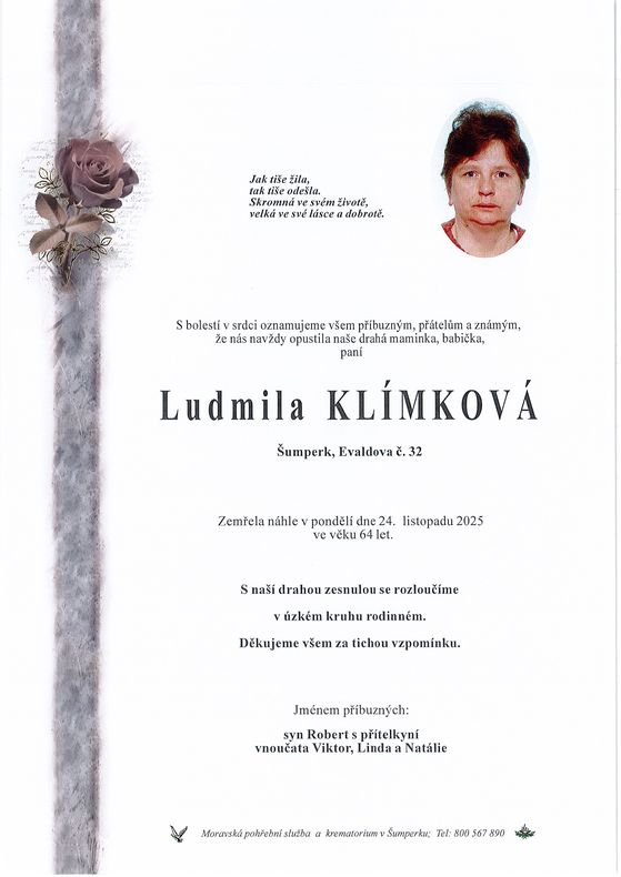 | Ludmila Klímková | 1961 | 24.11.2025 | Šumperk | bez obřadu |