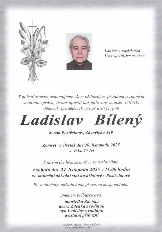 | Ladislav Bílený | 1948 | 20.11.2025 | Postřelmov | s obřadem |