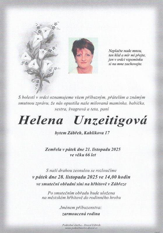 | Helena Unzeitigová | 1959 | 21.11.2025 | Štíty | s obřadem |