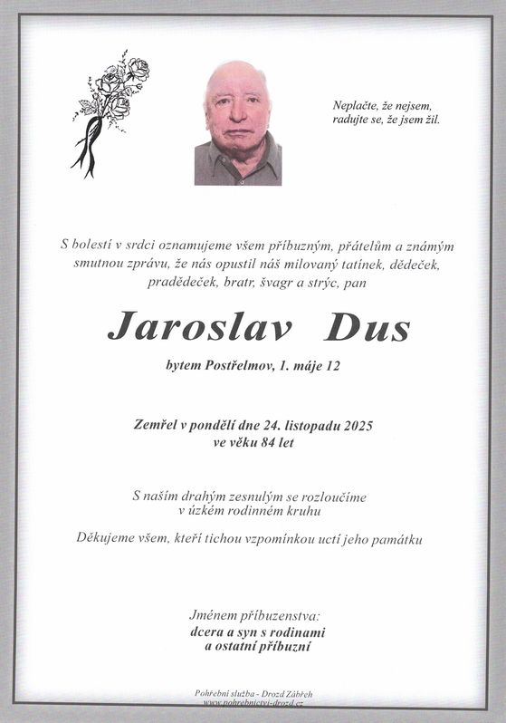 | Jaroslav Dus | 1941 | 24.11.2025 | Postřelmov | bez obřadu |